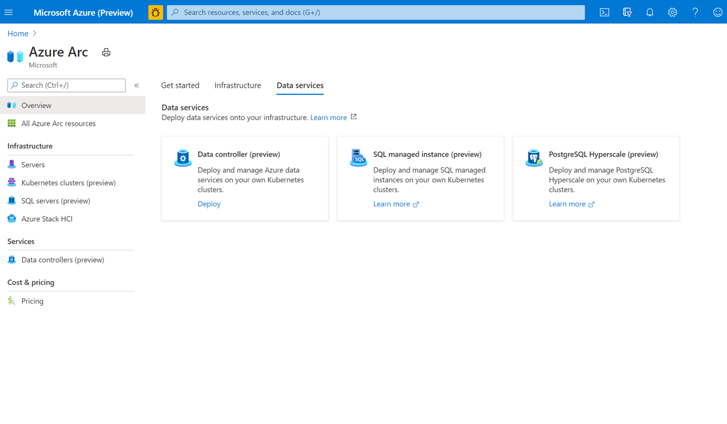 - Deploy Azure Arc–enabled Azure SQL and PostgreSQL Hyperscale (in preview) on any Kubernetes distribution and on any cloud.