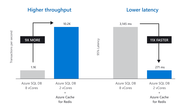 Use Azure Cache for Redis to accelerate your data layer through caching. Adding Azure Cache for Redis can increase data throughput by over 800 percent while increasing latency performance by over 1,000 percent1 at a cost-effective price. It’s a great way to efficiently scale applications and improve user experience without the expense of rearchitecting your underlying database.