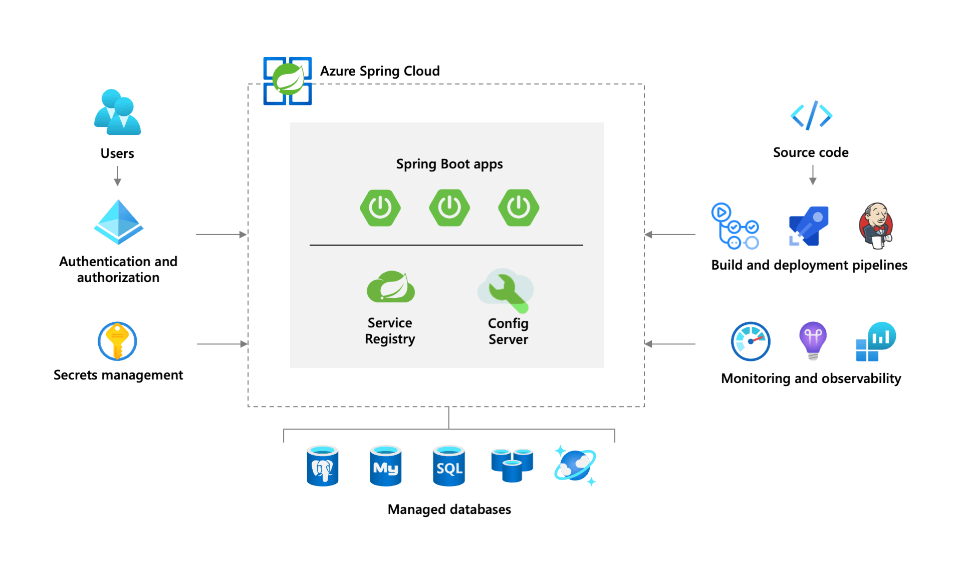 Easily deploy, operate, and scale your Spring Boot apps in a fully managed environment with Azure Spring Apps. Get even more functionality with Azure Spring Apps Enterprise, which adds fully managed VMware Tanzu components, advanced configurability, and Spring Runtime support.