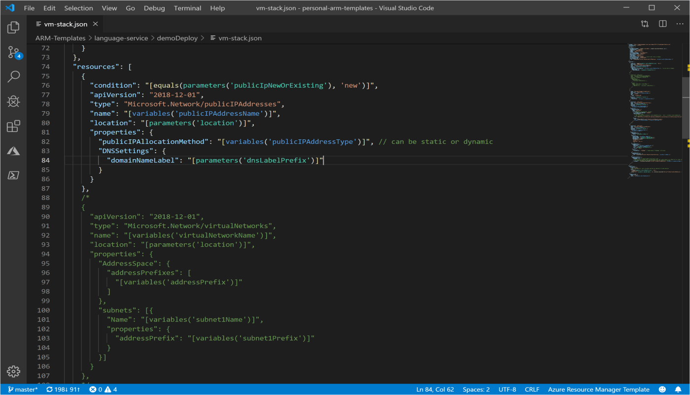 Enhance your template development authoring experience by using the Visual Studio Code extension for Resource Manager. Use features like syntax highlighting for Resource Manager language functions, support for comments, and IntelliSense code completion to develop your own templates and build on top of community-built samples that offer a variety of infrastructure and application patterns.