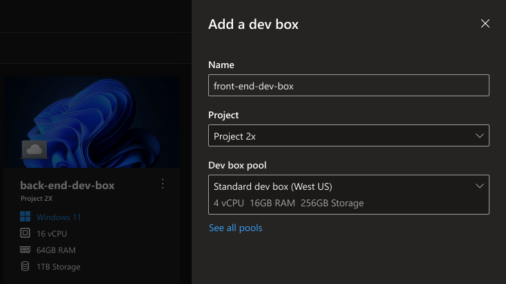 Dev Box aims to empower development teams to build any application on any tech stack using any tool. While in preview, as the service is starting with Windows support, any tool that works on the Windows operating system can be installed on a dev box. Dev boxes also support development and debugging of applications and cross-platform applications that run on Linux using Windows Subsystem for Linux.