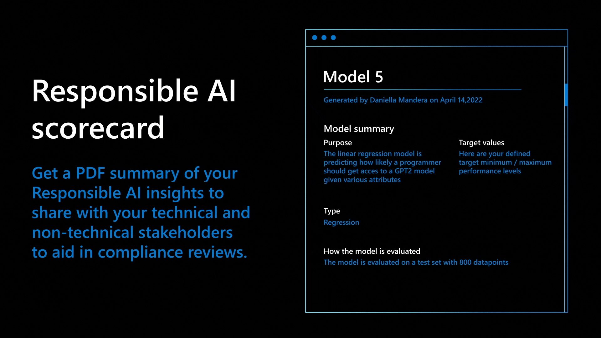 Apply responsible AI throughout the machine learning development lifecycle to build fair, explainable, and performant applications that earn the trust of customers. The responsible AI dashboard consolidates responsible AI capabilities to support deep-dive investigations in your flow of work, while model monitoring helps you optimize performance in production. Contextualize responsible AI metrics for business audiences with the responsible AI scorecard (preview) to streamline AI governance, compliance, and collaboration.