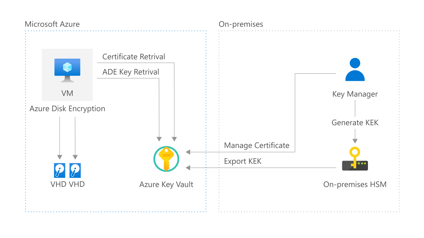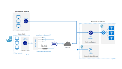 Extend a network from on-premises or from Azure Stack to an Azure virtual network using a site-to-site virtual private network (VPN). Traffic flows between the on-premises network and Azure through an IPsec VPN tunnel or through the Azure Stack multitenant VPN gateway.