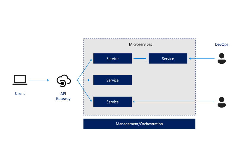 Choose your team's preferred deployment approach, language, microservices platform, and programming model for each service. Publish your microservice APIs for internal and external consumption while managing crosscutting concerns such as authentication, authorization, throttling, caching, transformation, and monitoring with Azure API Management.