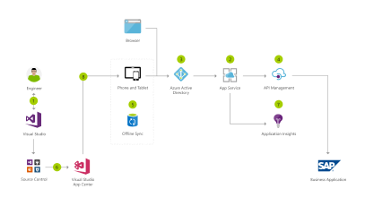 This mobile workforce app architecture uses Active Directory to secure corporate data from an SAP back end system, delivered to devices via Azure App Service API Management.