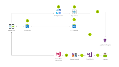 This consumer mobile app architecture uses Azure App Service Mobile Apps to simplify authentication with multiple social identity providers, store data and sync it for offline access, and send push notifications.